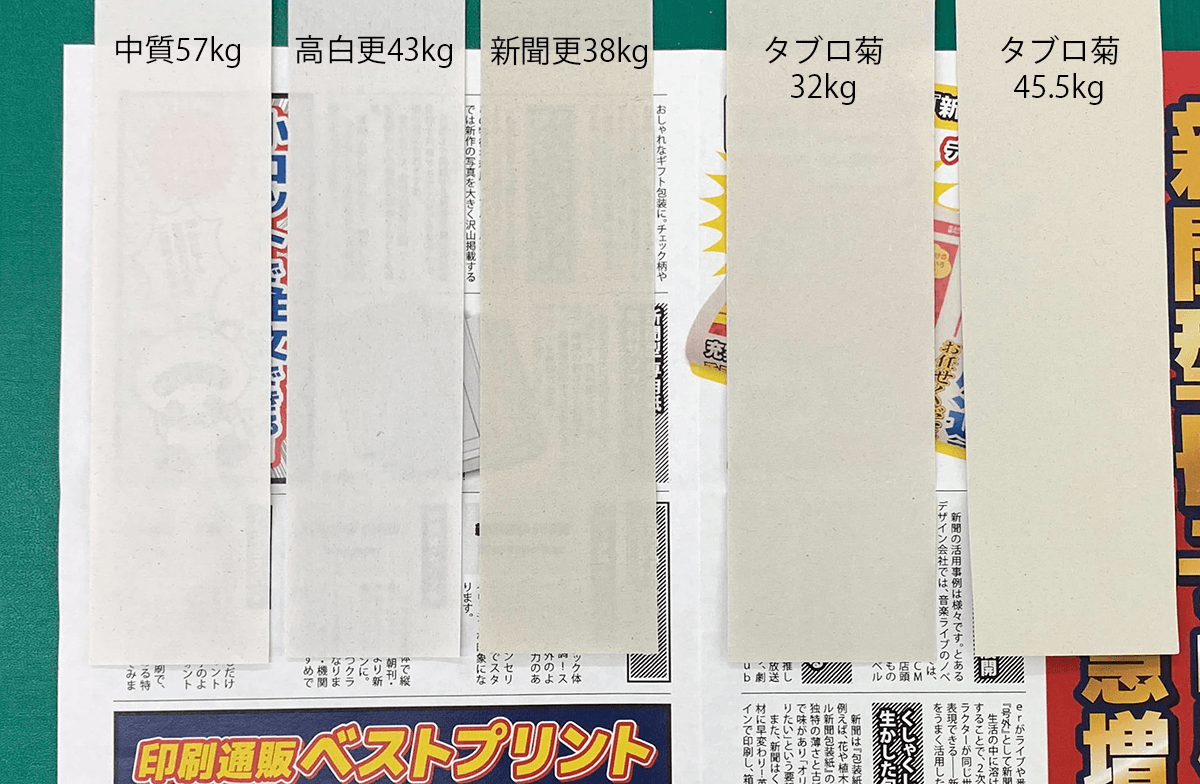 新聞型冊子印刷でご利用いただける紙の比較写真です。種類によって、白色度や厚みが異なります。