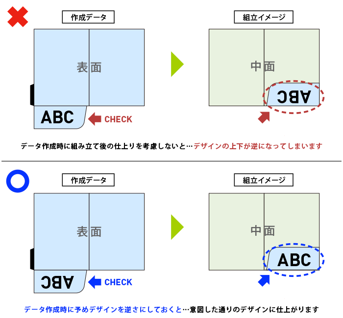ポケットファイルは組み立てる商品のため、内側に折り込まれるポケット部分のデザインを考慮して作成する必要があります。