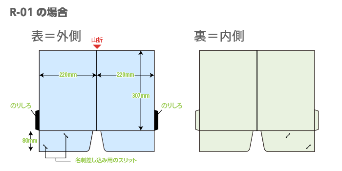 テンプレートファイルは、用紙を挟み込むためのポケット部分が付いた見開きの展開図となっています。