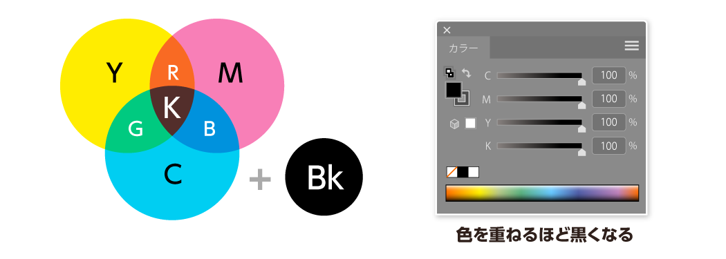 ※Kは通常、黒インキで印刷されるため、黒色のことを指す場合がほとんどです。ただし『Kuro(黒)』や『blacK(ブラック)』を意味しているわけではありません。本来は印刷機において、印刷物の文字や図の輪郭、細部を表現するために、CMYとは別に作られた版のことを『Key plate(キー・プレート)』と呼んでいたことに由来しています。