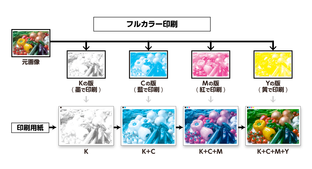 CMYK は『Cyan(シアン)』『Magenta(マゼンタ)』『Yellow(イエロー)』と『Key plate(キー・プレート)』から、それぞれ頭文字1字を取ったものです。印刷では、CMYK の4版を掛け合わせて色を作っていきます。